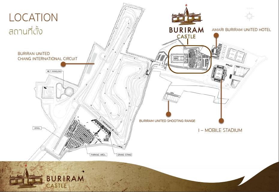 สถานที่ตั้งโครงการ Buriram Castle เป็นศูนย์กลางที่ตั้งอยู่ระหว่าง สนามฟุตบอล i-mobile stadium และสนามแข่งรถ Chang International Circuit ซึ่งทั้ง 2 สถานที่ถือว่าเป็นที่สุด ของจังหวัดบุรีรัมย์และของประเทศไทย (i-mobile Staidium เป็น Football Stadium ที่มีความจุมากที่สุดในประเทศที่ผ่านมาตรฐานฟีฟ่า ส่วน Chang International Circuit เป็นสนามแข่งรถที่ได้มาตรฐานระดับโลก FIA Grade 1 และ FIM Grade A แห่งเดียวในประเทศไทย)