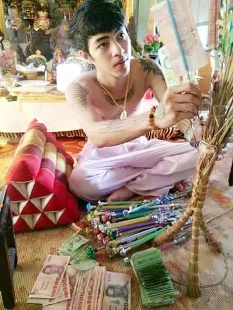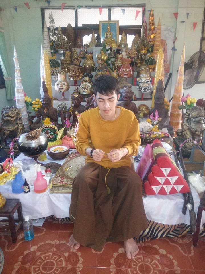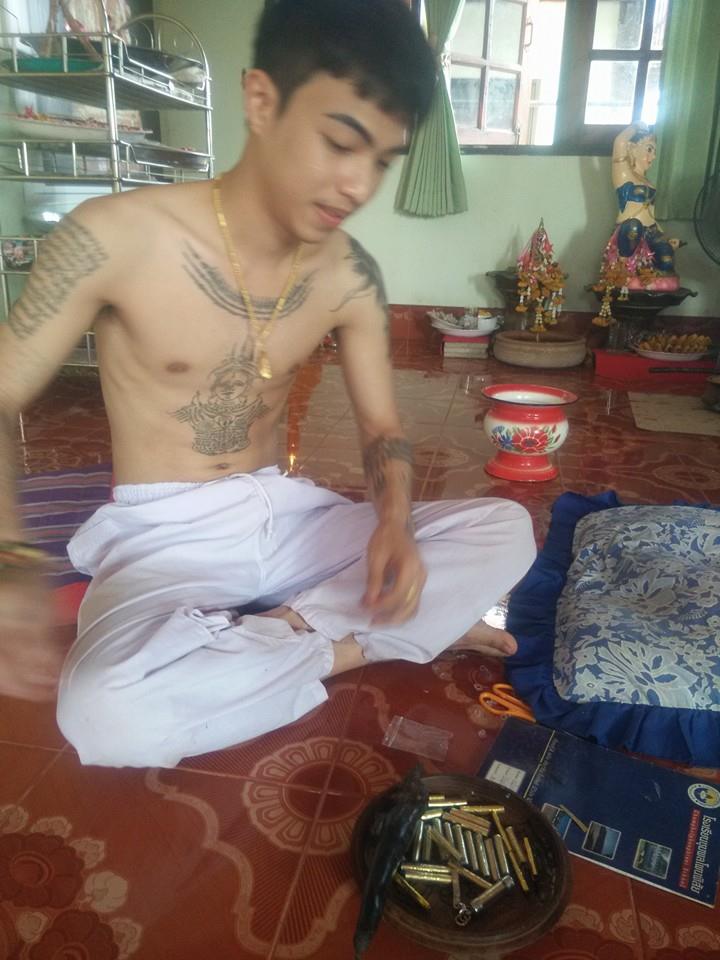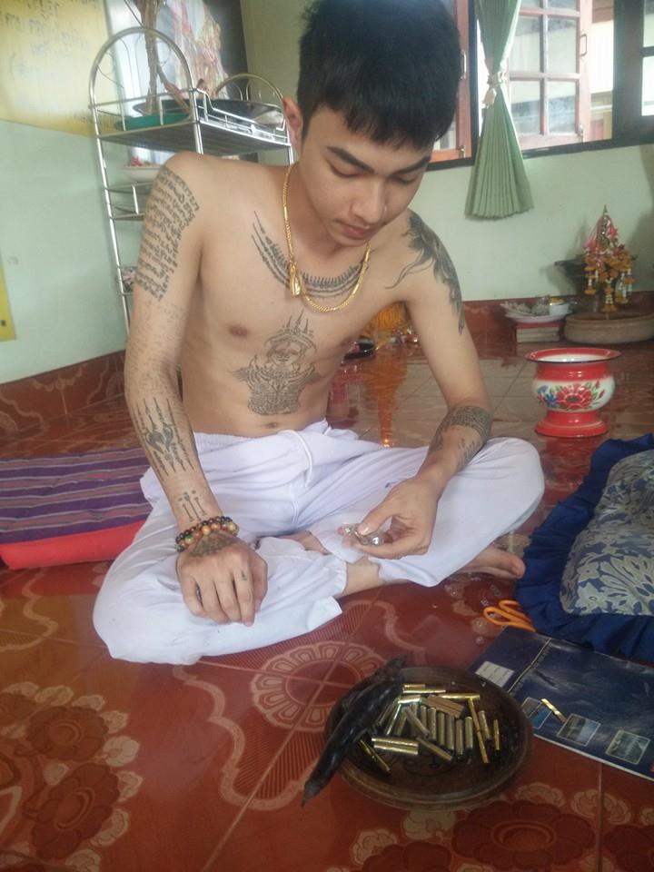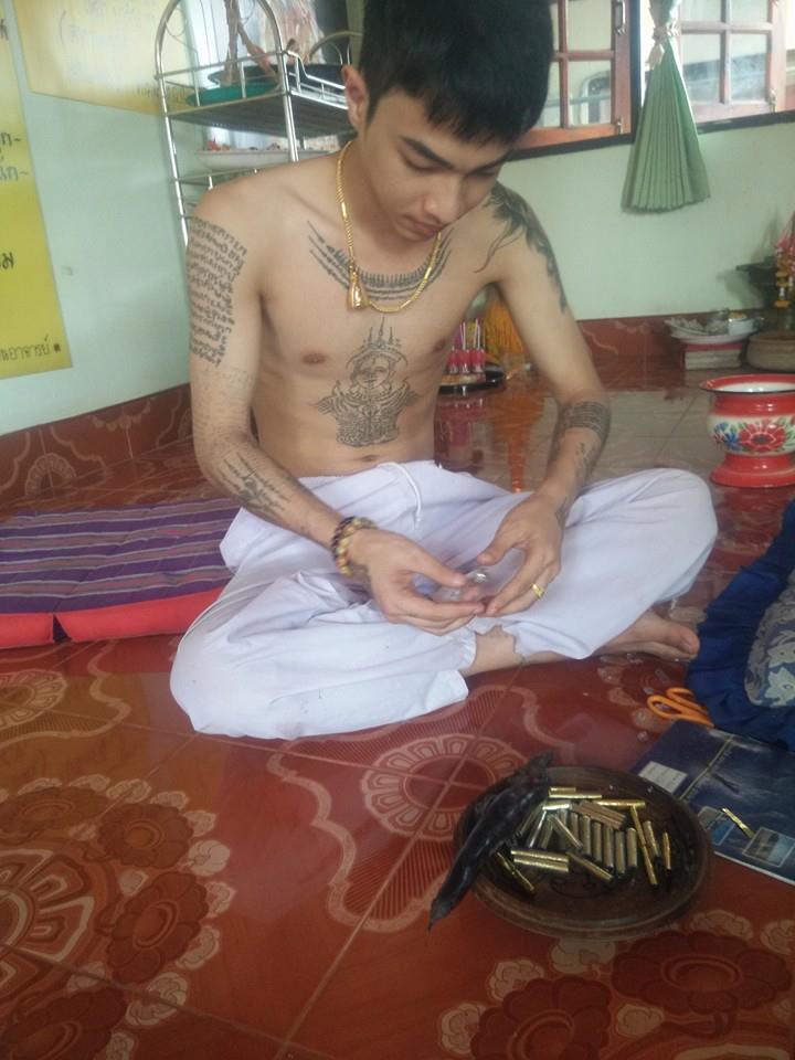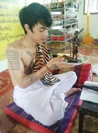 ขณะกำลังปลุกเสกตะกรุด และสักยันต์ให้กับลูกศิษย์ลูกหา ซึ่งส่วนใหญ่เป็นวัยรุ่นหนุ่มสาว ที่เดินทางมาจากจังหวัดต่างๆ เพื่อให้อาจารย์รูปงามลงอักษระให้