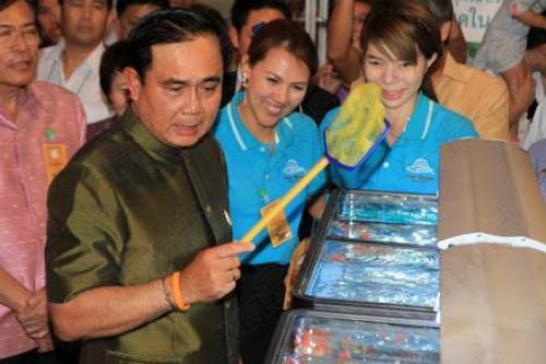 โดยนายกรัฐมนตรี กล่าวติดตลกในช่วงต้นว่า เปิดตลาดนี้อีกครั้งเหมือนเป็นการเปิดตลาดนายกฯ เพื่อให้เป็นแหล่งพบปะและซื้อสินค้าอีกทางเลือกหนึ่ง อย่างไรก็ตามวันนี้อ่านข่าวในหนังสือพิมพ์เห็นข่าวในกระทรวงเกษตรฯยกมือไหว้เหมือนเป็นการขอฝน ทำให้คิดว่าปีนี้มันจะรอดหรือไม่ ก็ยอมรับว่าเป็นห่วงในเรื่องน้ำ ก็อยากให้ช่วยกันอธิฐานขอเทวดาขอนางแมวให้ฝนตกในที่เกษตรกรทำนา ไม่อยากให้ตกในกรุงเทพฯมากนัก เพราะตกแล้วก็เดือดร้อน แต่ก็ต้องเข้าใจว่าวันนี้ค่อนข้างที่จะมีการเปลี่ยนแปลง