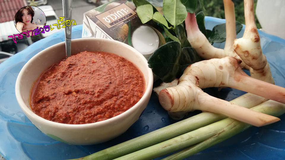 พริกแกงกะทิ ส่วนผสม พริกแห้ง กระเทียม หอมแดง ตะไคร้ พริกไทยดำ ขมิ้น บดหรือตำให้ละเอียด