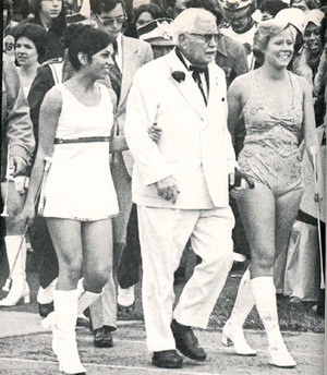 ผู้พันแซนเดอร์สยืนโพสต์ท่ากับเสื้อสูทสีขาวอันเป็นเอกลักษณ์ (ประมาณปี 1970)
