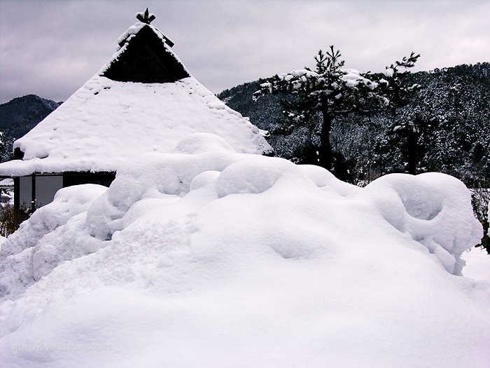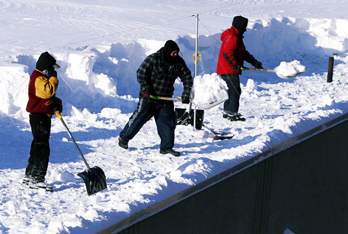 5. และก็ต้องถือพลั่วถือเสียมมานั่งแซะหิมะ มากวาดหิมะลงจากหลังคา