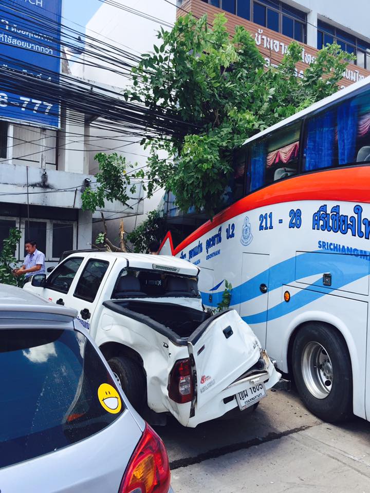 เมื่อเวลา 12.30 น. วันนี้ (10 มิ.ย.2558) เกิดอุบัติเหตุรถทัวร์โดยสารปรับอากาศ เสียหลักพุ่งชนรถที่สัญจรผ่านไป-มา ก่อนเสียหลักพุ่งชนบ้านเรือนของประชาชนที่อยู่ริมถนน มีผู้ได้รับบาดเจ็บจำนวนมาก ที่เกิดเหตุบริเวณจุดกลับรถ ถ.หลังศูนย์ราชการตัดกับ ถ.หน้าเมือง ตรงข้าม กองบังคับการตำรวจตระเวนชายแดนภาคที่ 2 (ตชด.) เขตเทศบาลนครขอนแก่น พบรถทัวร์โดยสารปรับอากาศชั้น 2 สาย นครราชสีมา-ขอนแก่น-หนองคาย หมายเลขข้างรถ 211-28 หมายเลขทะเบียน 10-5794 นครราชสีมา พุ่งชนติดอัดก๊อบปี้กับร้านรับทำกุญแจ และร้านอาหารไทยและบ้านขนมไทย เลขที่ 228/30-31 ถ.หลังศูนย์ราชการ ต.ในเมือง อ.เมือง จ.ขอนแก่น ใกล้กันเจ้าหน้าที่พบรถยนต์และรถจักรยานยนต์ได้รับความเสียหาย จอดเรียงรายทั้ง 2 ฝั่งถนนและถูกอัดก๊อบปี้