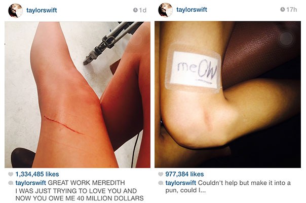 เราคงเคยได้ยินแต่ "การทำประกันชีวิต" แต่ล่าสุด เทเลอร์ สวิฟท์ (Taylor Swift) เธอได้โพสภาพเรียวขาของเธอที่ถูกน้องเหมียวข่วนผ่านอินสตาแกรมส่วนตัวของเธอ พร้อมข้อความที่ว่า "GREAT WORK MEREDITH I WAS JUST TRYING TO LOVE YOU AND NOW YOU OWE ME 40 MILLION DOLLARS" หลังจากนั้นก็มีรายงานจากสื่อต่างๆ ว่าเธอได้ทำ "ประกันเรียวขา" เอาไว้ถึงมูลค่า 40 ล้านดอลลาร์สหรัฐหรือมากกว่า 1,300 ล้านบาทไทย อืมมมม น่าสนใจแหะ! cosme*net เลยอยากรู้ว่ามีเซเลปคนไหนบ้างที่ทำประกันอวัยวะแปลกๆ นอกจากประกันเรียวขาเหมือนสาวเทเลอร์บ้าง?!