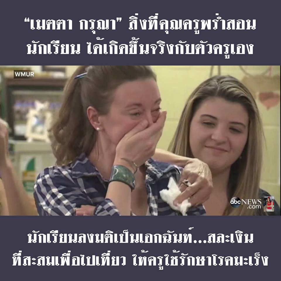 Courtney Vashaw ครูใหญ่ของโรงเรียนในเมืองเล็ก ๆ ใน New Hampshire ต้องเสียน้ำตาเมื่อเด็กนักเรียนปีสุดท้าย ตกลงกันอย่างเป็นเอกฉันท์ บริจาคเงินทุนกว่า 8000 เหรียญ ที่เพียรเก็บกันมา 4 ปีสำหรับการเที่ยวในปีสุดท้าย ให้แก่คุณครูที่ป่วยเป็นโรคมะเร็ง