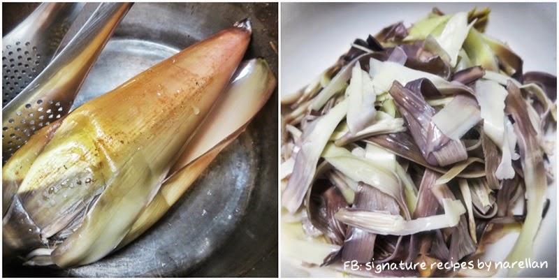หัวปลีลอกเปลือกหนาด้านนอกออกและนำไปต้มทั้งหัว แล้วก็ฉีกเป็นเส้น