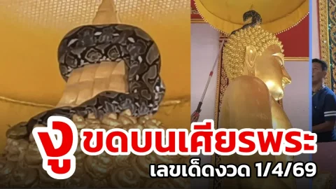 "ฮือฮา! งูเหลือมยักษ์ขดตัวบนเศียรพระพุทธรูปวัดดังนครนายก ชาวบ้านแห่ส่องเลขมงคลลุ้นรวย"