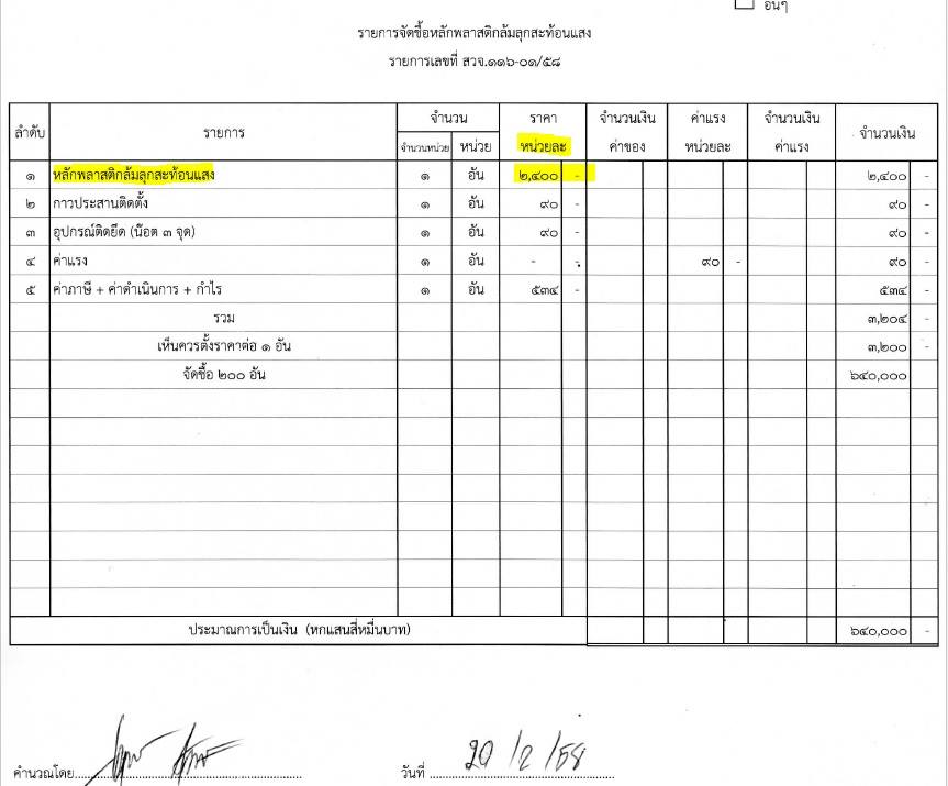 จากข้อมูลในเพจ Yuthana Lorsamran โพสข้อความว่าเอาอีกแย้ว!! โครงการ จัดซื้อหลักพลาสติกล้มลุกสะท้อนแสง โดย กทม. อันละ 2,400 บาท ยังไม่รวมค่าติดตั้ง หากรวม 3,200 บาท