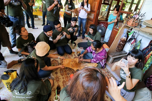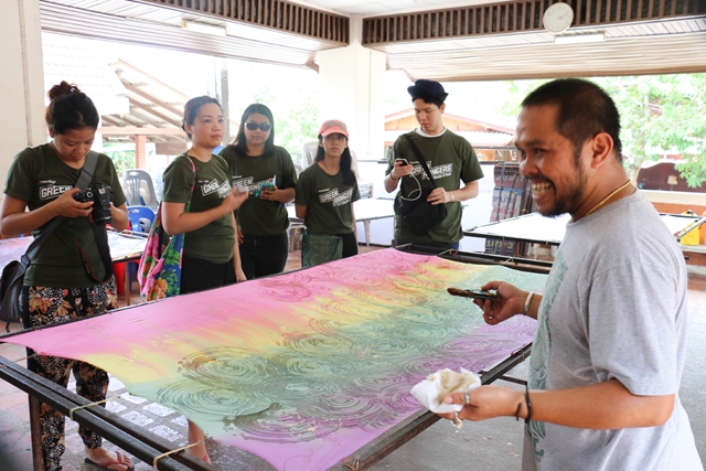 เยี่ยมชมกลุ่มลายเทียน การเขียนผ้าบาติกจากเทียน สีทั้งหมดที่ที่นี่ใช้จึงสกัดจากพืชท้องถิ่น ลายบาติกที่นี่แตกต่างจากที่อื่นด้วยสไตล์และเทคนิคการทำ พี่ตุ๊กแก ได้สาธิตให้พวกเราชม