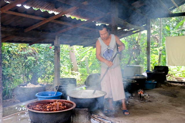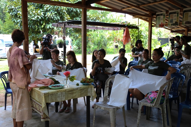เยี่ยมชมกลุ่มผ้ามัดย้อมสีธรรมชาติ สีย้อมที่นี่จะเป็นส่วนต่างๆ ของต้นไม้ เช่น เปลือกมังคุด แกน ราก ใบ ดอก และผล โดยพี่อารี