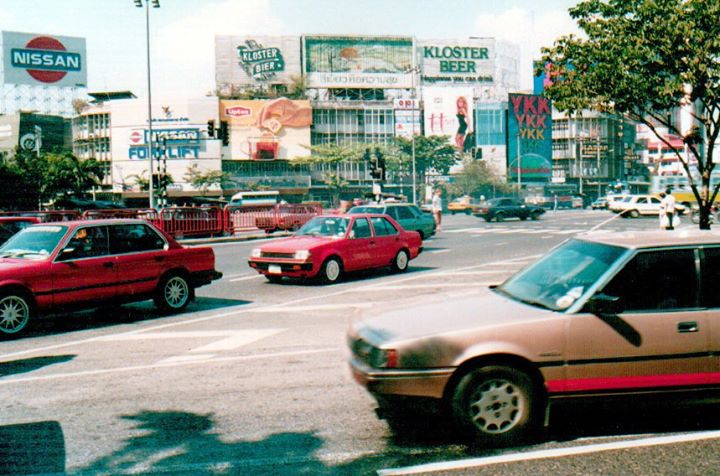 Bangkok 1988 ถนนพระราม1 แถวย่านสยามสแควร์ ปี 2531 ทางซ้ายมือยังเห็นความร่มรื่นย์ของแนวต้นไม้ และป้ายทางเข้าโรงแรมสยามอินเตอร์คอนติเนลตัน