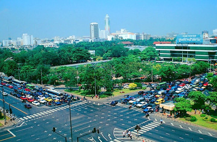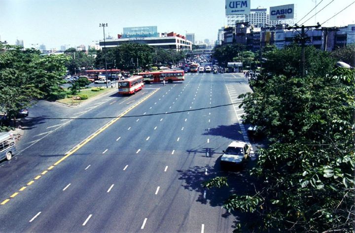 Bangkok 1988 แยกปทุมวันปี 2531 เลี้ยวซ้ายที่แยกคือทางไปสนามกีฬาถ้าตรงไปทางที่เห็นโฆษณาซิป ykk คือไปทางสะพานหัวช้าง,ราชเทวีและอนุเสาวรีย์ชัย