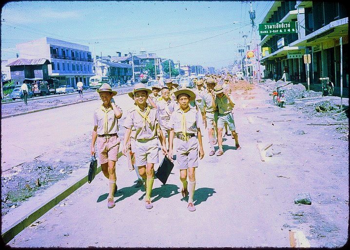 bkk 1961 ชอบภาพนี้มากค่ะถนนในกรุงเทพเมื่อ พ.ศ.2504 กับนักเรียนกำลังข้ามถนน นึกถึงเครื่องแบบสมัยเรียนเลย ยังเห็นรถเมล์ยังเป็นรถหลายสีด้วย..ใครทราบบ้างค่ะว่าแถวไหน