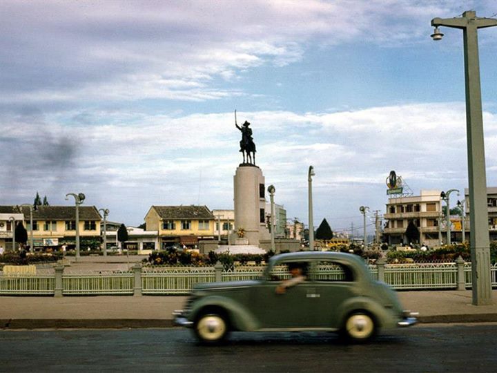 King Taksin Monument . People call it Wongwainyai.1961....ภาพที่หาดูยากอีกภาพหนึ่ง วงเวียนใหญ่สมัยเก่าที่เป็นภาพสี..ไม่ค่อยพบเจอกันนัก..ภาพนี้ปี 2504 เสาไฟฟ้ารอบๆสวยงามมาก..อาคารบ้านเรือนรอบวงเวียนเหล่านี้ยังดูสวยงามมาก....credit Keith's Old Military Photos