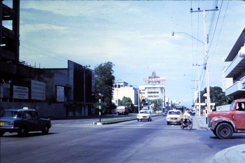 ถ่ายจากแยกราชเทวี มองไปไกล ๆ เห็นอนุสาวรีย์ชัยสมรภูมิ ซ้ายมือตรง Honeywell คือที่ทำการของบริษัทเอื้อวิทยา ฝั่งตรงข้ามที่เห็นต้นไม้เขียวๆ นั้นคือตรงที่เป็นโรงหนังเอเธนส์ ภาพนี้ปี 2512.. เครดิต ชาญณรงค์ บ๊อบบีเคเค จิ๊กโก๋อมตะ