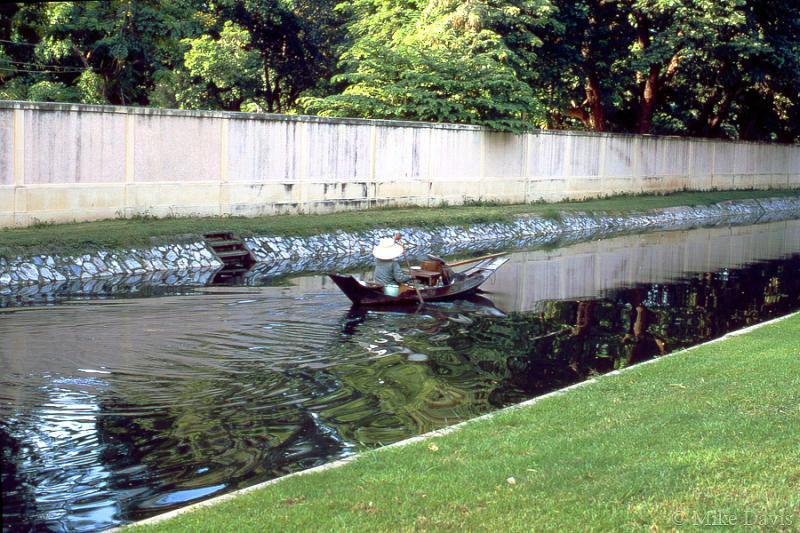 Klong Boat bangkok 1968 แม่ค้าพายเรืออยู่ในคลองเปรมประชากร (น่าจะเป็นแม่ค้าขายก๋วยเตี๋ยวหรือน้ำดื่มที่น่าจะกำลังพายเรือกลับมาจากหน้าวัดเบญฯ และกำแพงที่เห็นน่าจะเป็นรั้วกำแพงของสวนสัตว์เขาดิน ภาพเก่าปี 2511