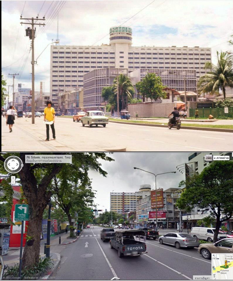 Silom on the corner of Soi Sala Daeng -bkk 1984 (up) and now 2013 (low)ภาพเปรียบเทียบถนนศาลาแดง สีลม ยุค พ.ศ.2527 และ 2556 อาคารตึกแถวเก่ามุมถนนยังไม่เปลี่ยนแปลงมากเท่าไร..แต่ที่เปลี่ยนคือมี รถ BTS เพิ่มขึ้นมาทางขวาของภาพ credit Bobcock