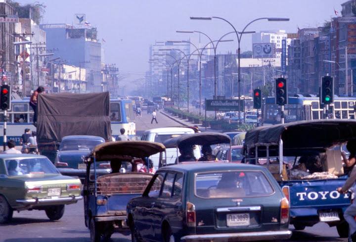 bkk traffic 1981 ภาพรถติดไฟแดงที่แยก หัวลำโพง ปี 2524..ตรงเกาะกลางมีป้ายเขียนไว้ว่า ต้นไม้เป็นเพื่อนชีวิต เจ้าดูดอากาศพิษแทนข้า.. ยุคนั้นยังอยู่ในยุคที่น้ำมันยังมีสารตะกั่วผสมอยู่ ไอเสียที่ออกมายามรถติดจึงเป็นพิษต่อสุขภาพมาก.. กทม.จึงเร่งปลูกต้นไม้ตามเกาะกลางเพื่อช่วยลดมลพิษในอากาศเราจึงเห็นคำขวัญนี้แทบจะทุกแยกถนนในสมัยนั้น