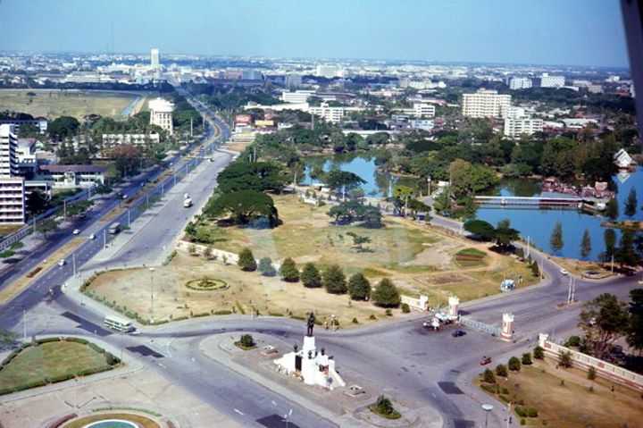 bangkok in 1971 Statue in square is of Rama VI. The park behind is Lumphini Park. The Dusit Thani Hotel is still there. The view has changed in the intervening years! ....กรุงเทพสมัยปี 2514.. ซ้ายมือถนนราชดำริ ขวาเป็นสวนลุม.. ใกล้เกาะลอย ยังเห็นภัตตาคาร กินรีนาวาอยู่.. ฝีมือถ่ายภาพของฝรั่งที่มาเที่ยวเมืองไทยในปีนั้น..ถ่ายจากห้องพักบนโรงแรมดุสิตธานีชั้น 21