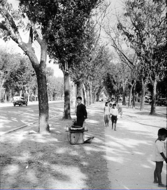Lumphinee Park with Khing Vajiravudh Monumentภาพคนเข็นรถ(คล้ายๆเกวียน)บรรทุกสิ่งของที่หน้าสวนลุม ปี 1950