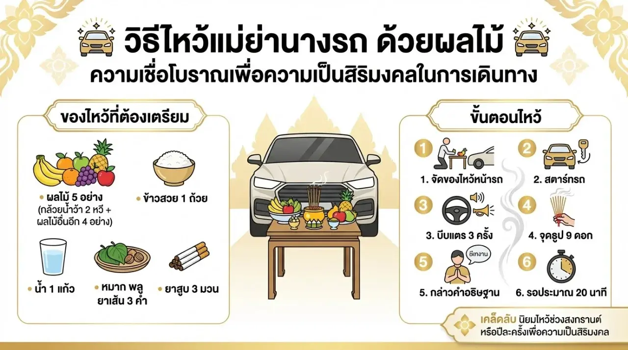 หนึ่งในวิธีที่นิยมกัน คือ การไหว้แม่ย่านางรถด้วยผลไม้ ซึ่งหลายคนทำกันช่วงปีใหม่ไทยหรือเทศกาลสงกรานต์ เพราะถือเป็นช่วงเริ่มต้นสิ่งใหม่ ๆ ของปี