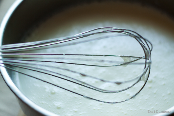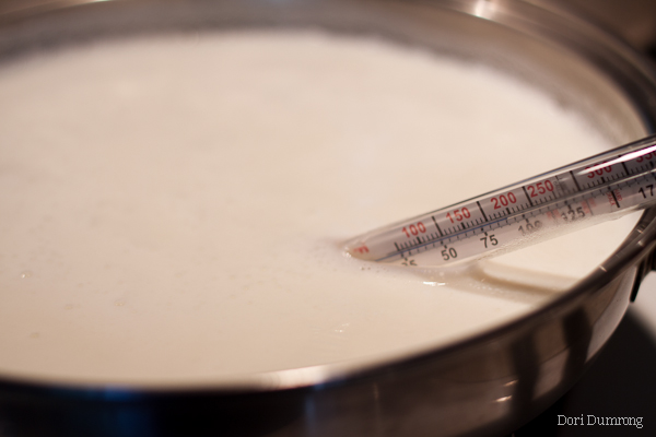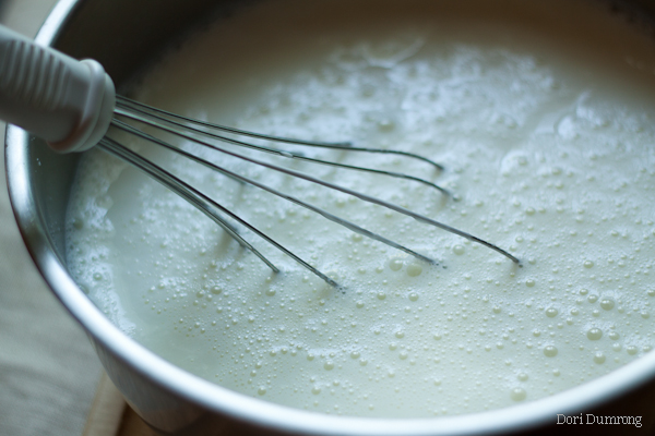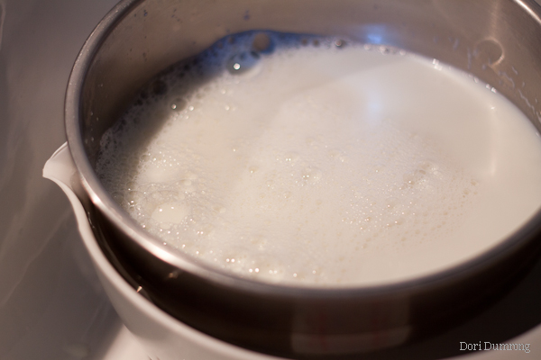 พอนมเิริ่มเดือดเป็นฟองนิดๆ (ถ้ามีเทอร์โมมิเตอร์ทำขนมลองวัดดู อุณหภูมิจะอยู่ที่ประมาณ 85-90 องศาเซลเซียส / 185-195 องศาฟาเรนไฮท์) ยกลง