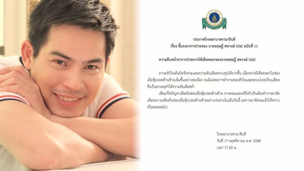 เมื่อเวลา 17.00 น. แพทย์โรงพยาบาลรามาธิบดี ได้ออกประกาศชี้แจงความคืบหน้าอาการป่วยของพระเอกหนุ่ม "ปอ ทฤษฎี" เป็นฉบับที่ 11 โดยมีเนื้อหาใจความสำคัญ จำเป็นต้องทำการผ่าตัดให้อย่างเร่งด่วน เพื่อระบายเลือดที่ยังคั่งอยู่ภายในช่องปอด ซึ่งจะเริ่มทำการผ่าตัดในช่วงเย็นวันนี้