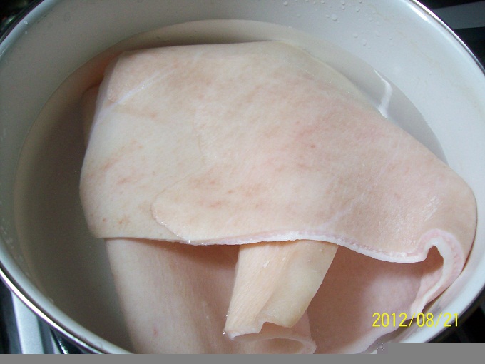 จับลงต้ม ใส่เกลือ จนกระทั่งหนังหมูเริ่มเปลี่ยนสภาพเป็นหนังใสๆ ตักขึ้นพัก เอามาล้างน้ำ