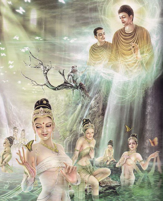 "ดูก่อนนันทะ ระหว่างนางสากิยานีผู้ชนบทกัลยาณี กับ นางฟ้าเหล่านี้ ใครมีรูปงามกว่า น่าดูกว่า น่าเลื่อมใสกว่า"