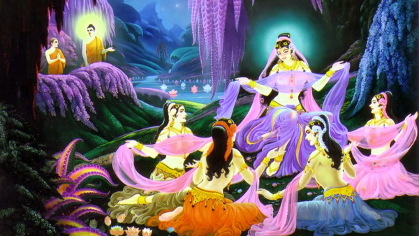 พระศาสดาทรงสดับเช่นนั้นแล้ว ทรงจับแขนของภิกษุนันทะไว้ ทรงจูงจิตให้ไปปรากฏในสวรรค์(สภาวะจิตสุข ของผู้มี จิตใจสูง) ได้เห็นเหล่านางอัปสร (นางฟ้า) ประมาณ ๕๐๐ นาง ซึ่งมีเท้างามดุจนกพิราบ (เรียวเล็กสีชมพู)
