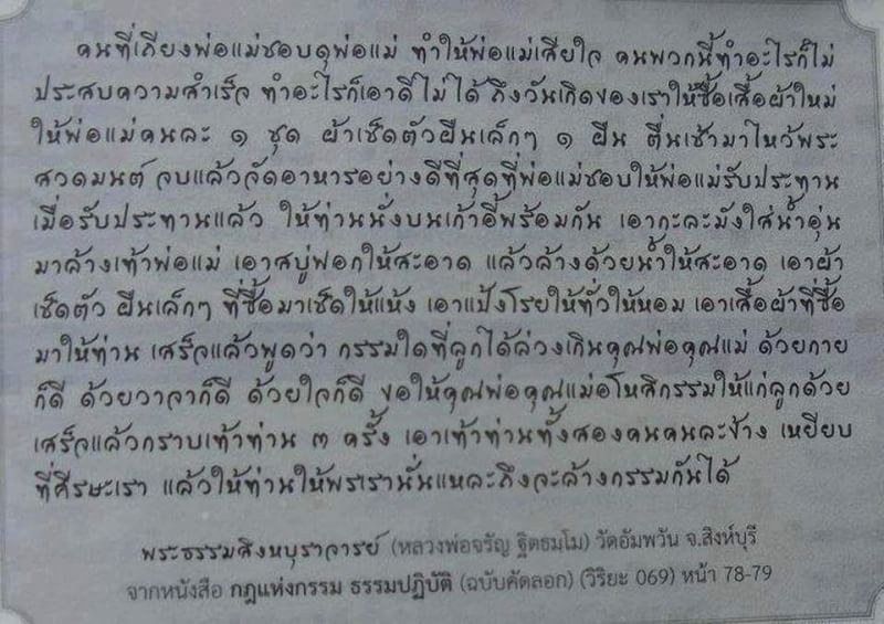 เราคงจำไม่ได้ว่าได้ก่อกรรมอะไรกับพ่อแม่บ้าง เราไม่รู้ได้เลยว่าสิ่งที่เราทำบางครั้ง ท่านอาจจะไม่พอใจก็ได้ เราอาจจะติดกรรมกับท่านได้ เพราะพ่อแม่เป็นพระอรหันต์ที่บ้านของลูก หากต้องการให้ชีวิตเราดีขึ้น