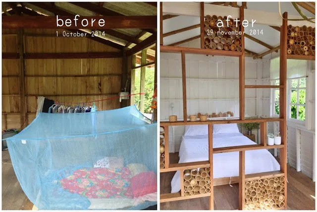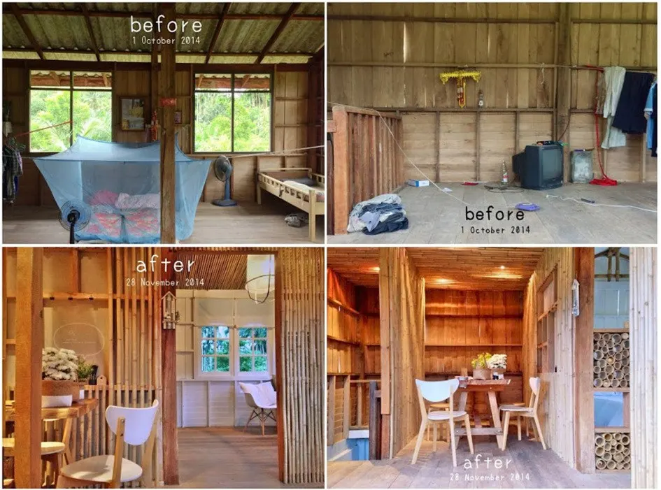 แม้จะมีงบน้อย ไม่สามารถเปลี่ยนแปลงโครงสร้างหลักได้ จึงต้องเก็บโครงสร้างเดิมไว้ เลือกติดเติมฝ้า ตกแต่งทาสีใหม่โทนหลักของบ้านเป็นขาว-น้ำตาล สีขาวเน้นความสะอาด สว่าง โปร่งโล่งมากขึ้นจากบ้านเก่า ใช้สีน้ำตาลจากไม้มาช่วยเพิ่มความรู้สึกอบอุ่นให้กับบ้าน และเพื่อดีงเอารู้สึกของทะเลกับไร่ของอำเภอกะเปอร์ ชุมชนเพาะปลูกติดทะเลในจังหวัดระนอง มาผสมผสานกันอยู่ในบ้าน จึงหยิบเอาเชือกของชาวประมงใช้มัดประดับที่ไม้ไผ่ คล้ายลักษณะการมัดผูกของบ้านพักแถบริมทะเล