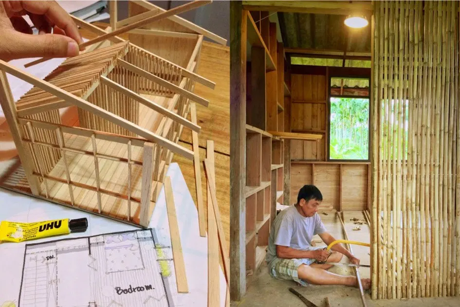 กลายเป็นความท้าท้ายเมื่อสถาปนิกต้องดีไซน์ภายใต้ข้อจำกัดเรื่องงบประมาณ เมื่อกลับมาถึงบ้าน เบสท์เลือกที่จะรีโนเวทบ้านหลังเก่าที่เค้าเติบโตมาด้วยเงินเก็บจากการทำงานที่กรุงเทพ เริ่มต้นปรับปรุงที่ห้องน้ำ เพราะอยากจะให้แม่ที่ขยับขาไม่ค่อยสะดวกได้นั่งชักโครก ได้งานห้องน้ำใหม่ที่สะดวกสบาย ลงมือปรับปรุงทาสี กั้นพื้นที่เปียก-แห้ง เพิ่มความน่าสนใจด้วยไม้ไผ่ในระแวกบ้าน มาตากแห้ง แช่น้ำ ทาน้ำยากันมอด ปลวกและความชื้น มาทำเป็นผนังส่วนฝักบัวอาบน้ำ ช่วยกันกับคุณพ่อทำการรีโนเวทไปยังส่วนต่างๆในบ้าน ห้องนอน ห้องทำงาน ส่วนนั่งเล่น ชั้น 1 และชั้น 2 จนเสร็จสมบูรณ์ทั้งหลัง ด้วยทุนค่าใช้จ่ายยังอยู่ในหลักหมื่นบาท