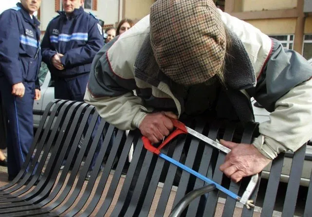 การประท้วงในตูลูส ฝรั่งเศสเมื่อปี 2006 มีการเลื่อยเอาที่วางแขนกลางม้านั่งออก เนื่องจากมันเป็นสิ่งกีดขวางการนอนบนม้านั่ง