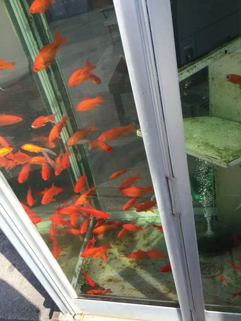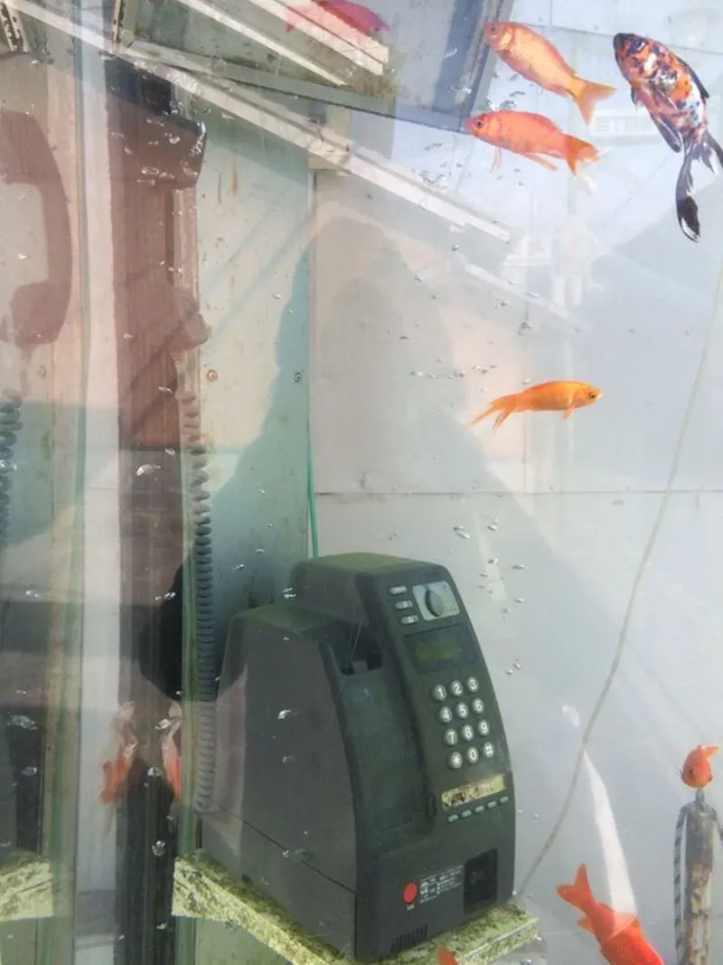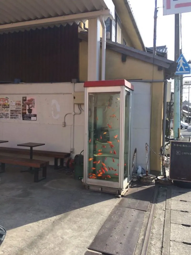 เราเห็นตู้ปลานอกสถานที่ตามพวกพิพิธภัณฑ์หรืองานแฟร์ต่างๆอยู่บ่อยๆ แต่ที่นี่แหล่งช้อปปิ้งเก่าแก่ของนาระ แถบยานากิ มีตู้ปลาขนาดใหญ่ที่ดัดแปลงมาจากตู้โทรศัพท์ ข้างในมีปลาทองจำนวนมากแหวกว่ายอยู่