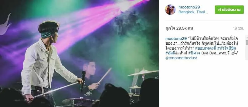 ล่าสุดหนุ่มโต่โน่ ก็ออกมาโชว์ความแมนโพสต์ข้อความผ่านทางอินสตราแกรม ว่า “ ไม่มีฟ้าหรือดินใดๆ จะสั่งให้ใจของเรา ถ้ารักกนจริง ก็พูดมันไป.. ไม่ต้องใครบงการให้ทำ” # ชอบเพลงนี้ # หัวใจลิขิต# อัสนี&วสันต์# ปีศาจ Bye Bye.. สระบุรี”