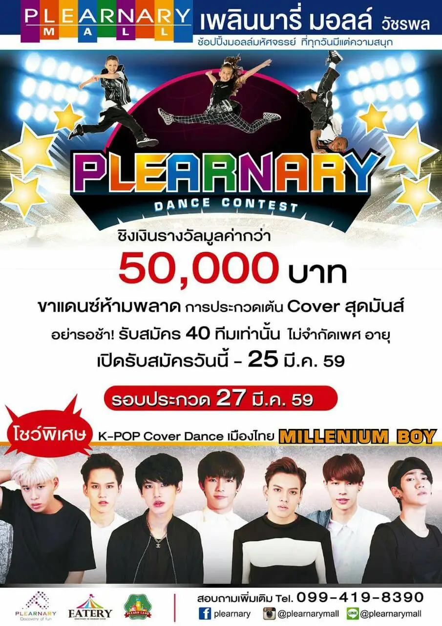 เตรียมตัวให้พร้อมสำหรับนักเต้นโคฟเวอร์แดนซ์ที่อยากวาดลวดลายและลีลาการเต้นกับกิจกรรม “เพลินนารี่ แดนซ์ คอนเทสต์” ในวันอาทิตย์ ที่ 27 มีนาคมนี้ ณ ศูนย์การค้า”เพลินนารี่ มอลล์(วัชพรพล)” ไม่จำกัดอายุและสมาชิกในทีม แต่จำกัดผู้เข้าสมัครเพียง 40 ทีมเท่านั้น !! ชิงเงินรางวัลกว่า 50,000 บาท พร้อมชมโชว์เต้นโคฟเวอร์สุดพิเศษจากวง millenium boy ติดตามรายละเอียดเพิ่มเติมและสมัครได้ที่แฟนเพจ Plearnary Mall ตั้งแต่วันนี้จนถึงวันศุกร์ ที่ 25 มีนาคม 2559