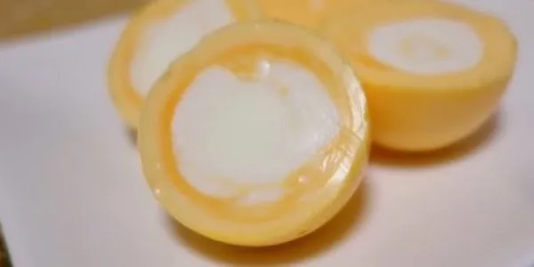 หลังจากนั้น นำมาใส่น้ำที่มีน้ำแข็งอยู่ ปอกเปลือกออก เทปจะหลุดล่อนออกมาง่ายมาก พอปอกเสร็จแล้ว ผลที่คุณได้คือ ไข่ที่มีไข่แดงอยู่ด้านนอก และไข่ขาวไปอยู่ด้านใน ตามภาพเลย!