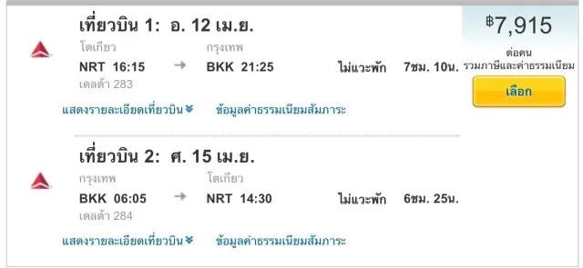 เส้นทางบินตรง โตเกียว (นาริตะ) – กรุงเทพ (สุวรรณภูมิ) จากสายการบิน Delta ราคาโปรใหม่ ไป-กลับ เริ่ม 7,915 บาท รวมทุกอย่างแล้ว ฟรี! โหลดกระเป๋า 2 ใบ ใบละไม่เกิน 23 ก.ก. หาคุ้มกว่านี้ไม่มีอีกแล้ว