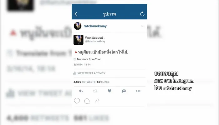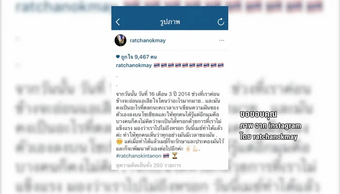 ล่าสุด "เมย์ รัชนก" ได้โพสต์ข้อความถึงความสำเร็จที่เกิดขึ้นทางอินสตาแกรมส่วนตัวว่า "จากวันนั้น วันที่ 16 เดือน 3 ปี 2014 ช่วงที่เราค่อนข้างจะอ่อนแอเสียใจโดนว่าอะไรมากมาย และมันคงเป็นอะไรที่ตลกนะคะเวลาเราเขียนความฝันของตัวเองลงบนโซเชียลและให้ ทุกคนได้รู้ แต่อีกมุมคือบางคนก็คงไม่คิดว่าจะเป็นได้หรอก ด้วยการที่เราไม่แข็งแรง มองว่าเราไปไม่ถึงหรอก วันนี้เมย์ทำได้แล้วค่ะ ทำให้ทุกคนเห็นว่า ทุกอย่างมันมีเวลาของมัน แต่เมื่อทำได้แล้วเมย์ก็จะรักษาและประคองมันไว้และก็จะพัฒนาตัวเองต่อไปอีก ค่ะ"