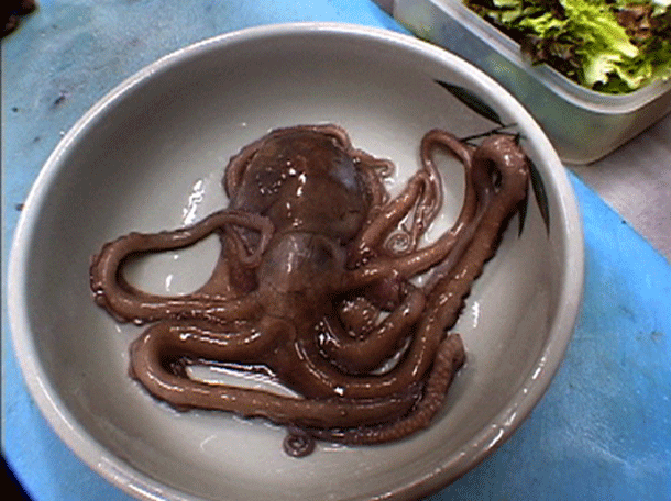 ปลาจะถูกพันหัวกับเครื่องในเอาไว้เพื่อให้มันยังมีชีวิต แล้วก็เอาไปทอด และอ้าปากพะงาบๆ อยู่กลางโต๊ะอาหารมองดูคนที่กำลังคีบเนื้อบางส่วนของมันเข้าปาก เมนูนี้คนที่ทำและกินมันได้ จิตใจนั้นทำด้วยอะไรเนี่ย พวกเขาอ้างว่าเพื่อให้ได้กินเนื้อปลาที่มีความสดมากถึงมากที่สุด เอาเถอะเอาที่พวกเมริงสบายใจ