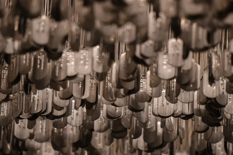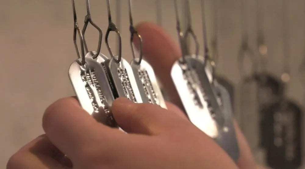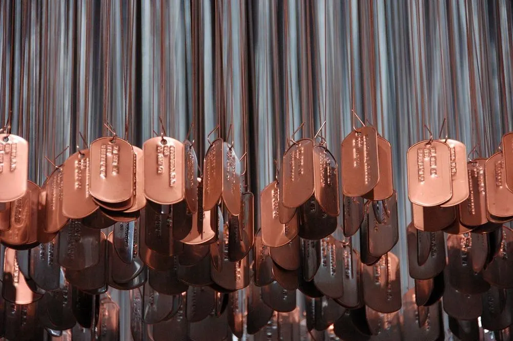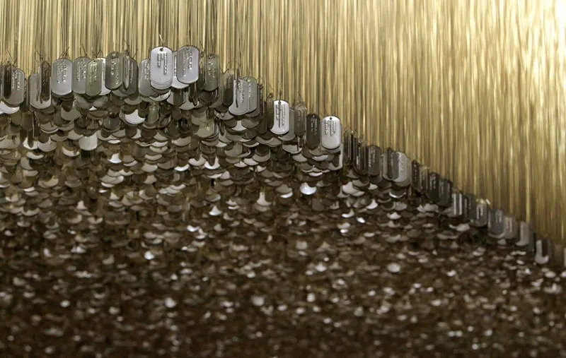 ป้ายด็อกแท็กถูกแขวนห้อยลงมาจากเพดานรวมกันเป็นรูปสี่เหลี่ยมขนาดใหญ่ 410 ตารางฟุต แต่ละป้ายบันทึกชื่อพลทหาร สังกัด และวันที่เสียชีวิต