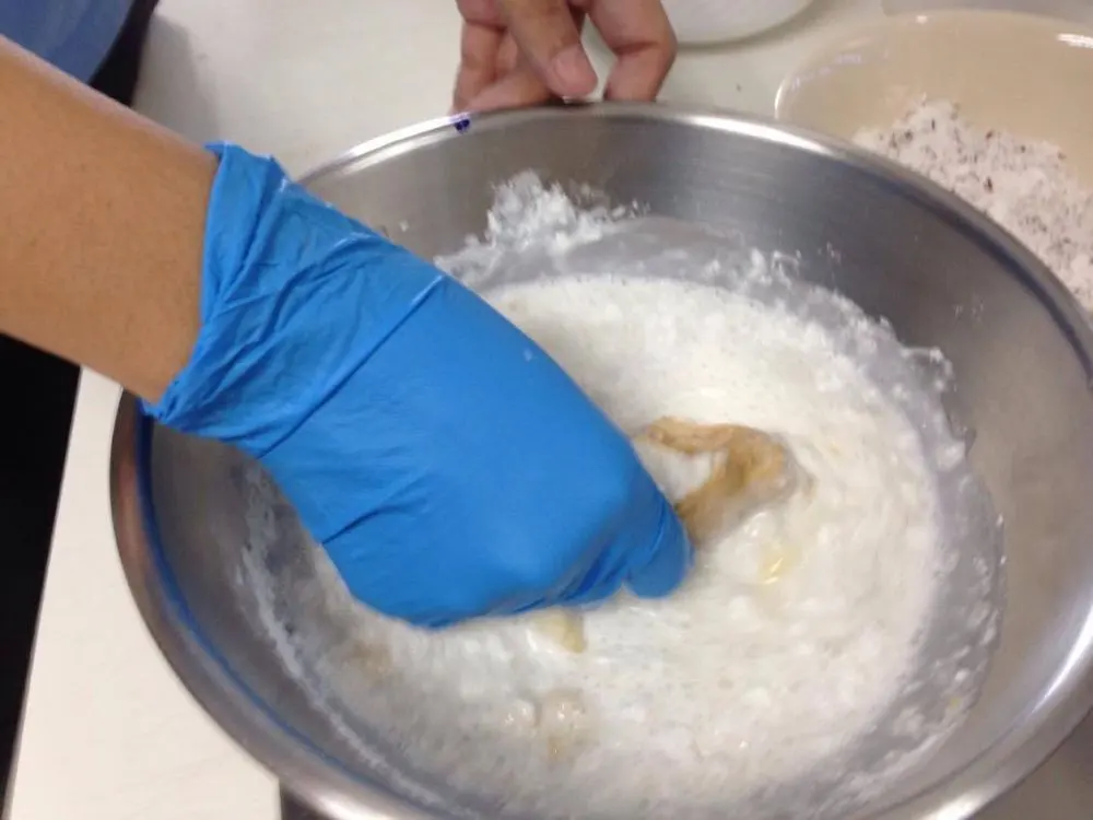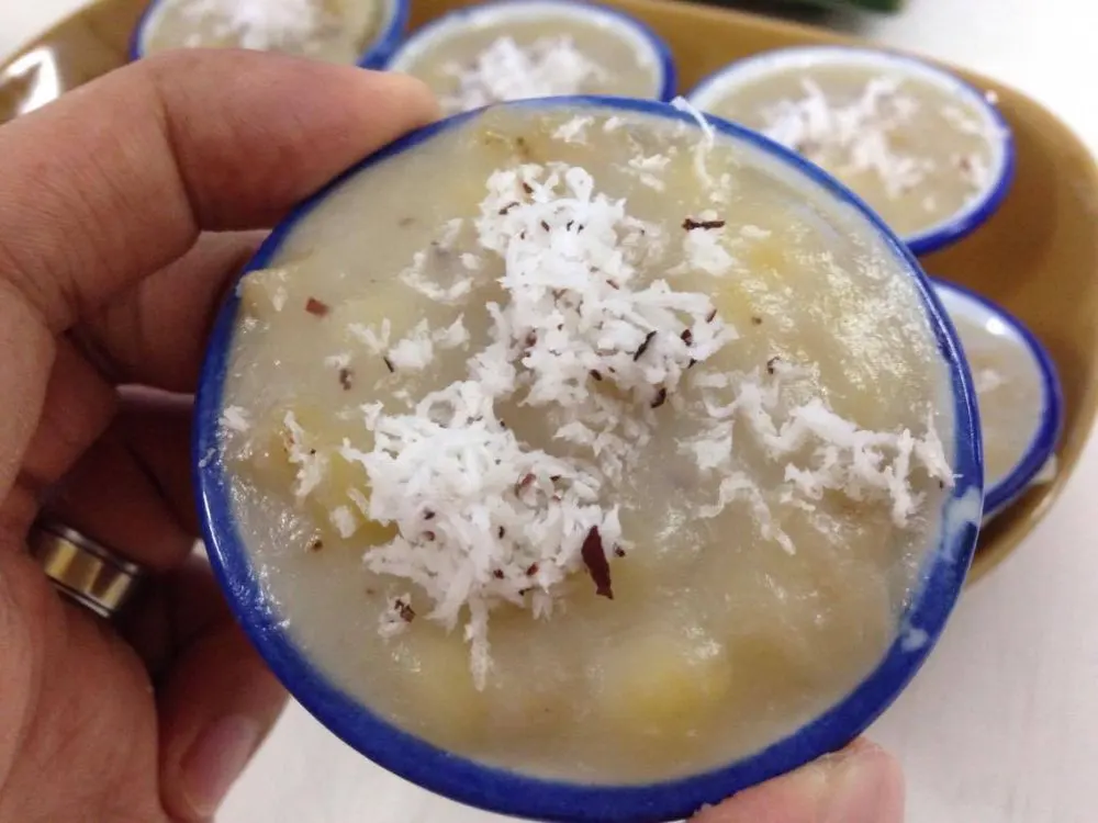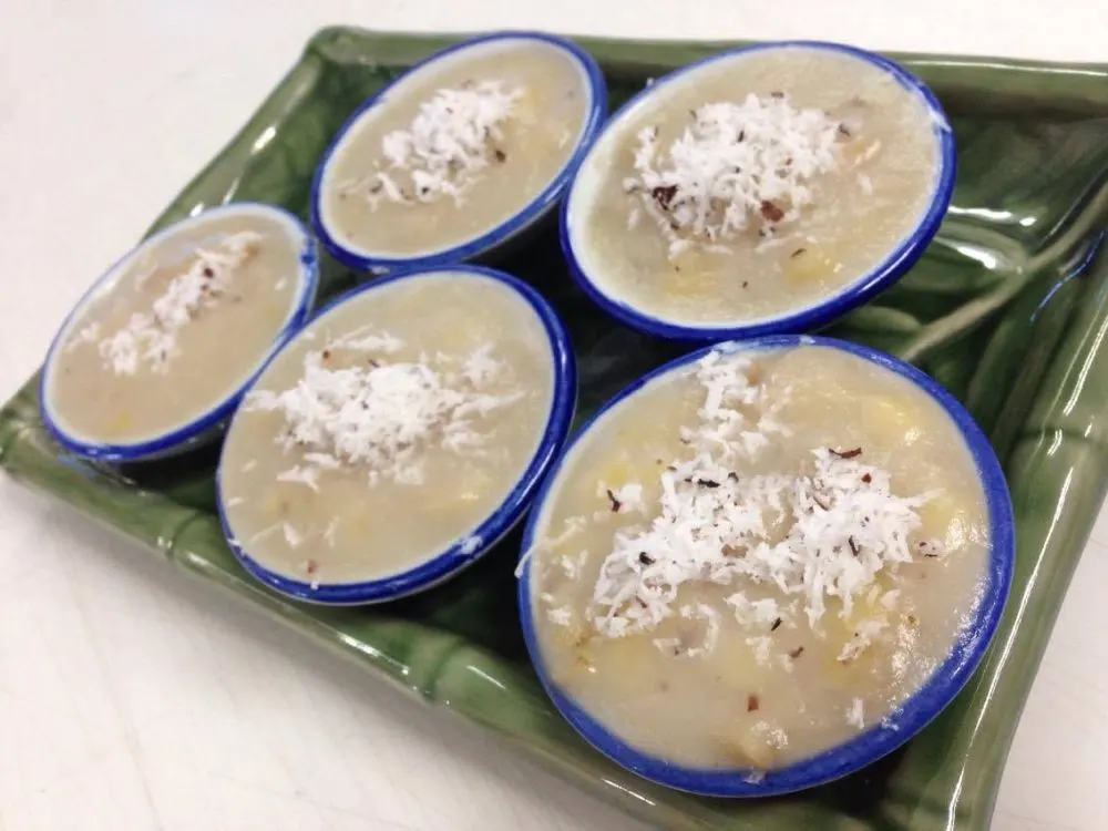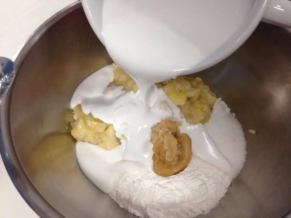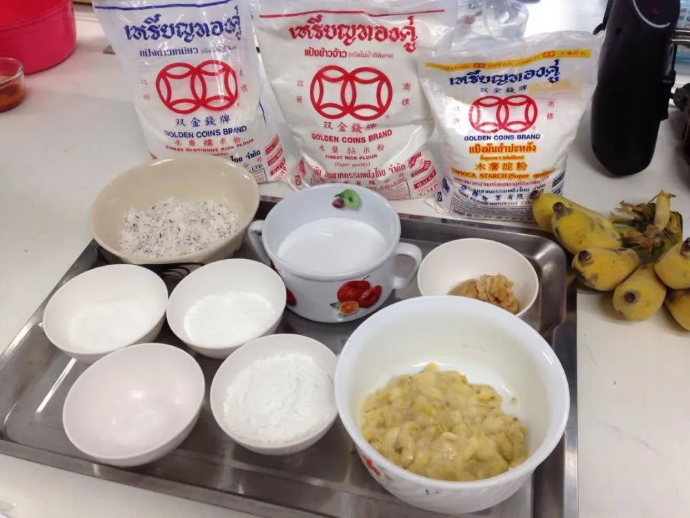 1. ผสม"แป้งข้าวจ้าว ตราเหรียญทองคู่" / "แป้งมัน ตราเหรียญทองคู่" / "แป้งข้าวเหนียว ตราเหรียญทองคู่" / "กล้วย" / "น้ำตาลทราย" / "น้ำตาลปี๊บ" / "กะทิ" และ"เกลือป่น" ให้เข้ากัน