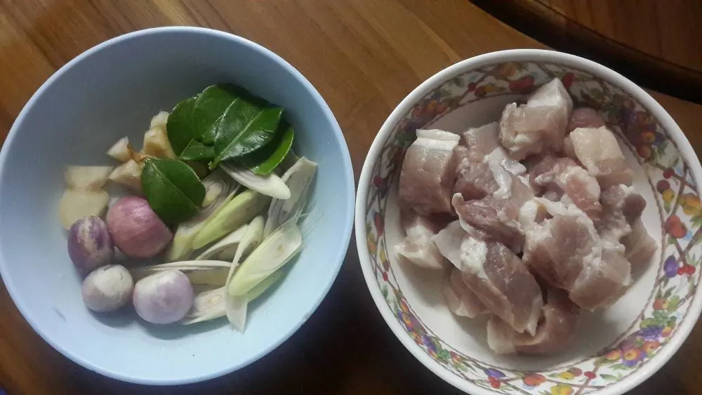 ในระหว่างที่รอน้ำปลาร้าสุกเราก็มาหั่นหมู ตะไคร้ ใบมะกรูด ข่า และหอมแดงรอกันครับ