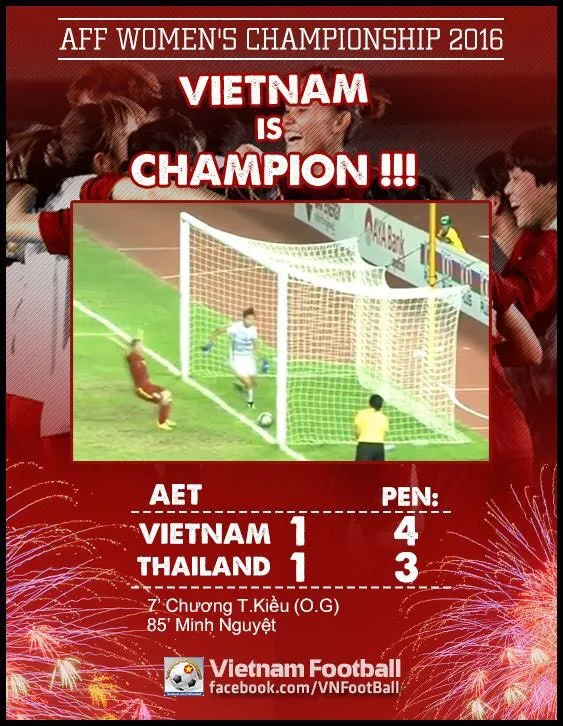 โดยทีมสาวไทยเสมอกับเวียดนาม1-1 ในเวลา 120 นาที ทำให้ต้องดวลลูกโทษตัดสิน ซึ่งเวียดนามเป็นฝ่ายที่ได้เปรียบเพราะถ้าหากว่ายิงเข้าประตูจะคว้าแชมป์ทันที