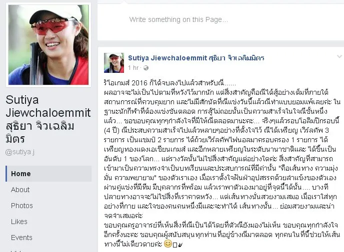 ล่าสุด ....บอกตรงๆ ว่ามีลุ้น กับกีฬาอีกหนึ่งประเภท นั่นคือ....."ณี" สุธิยา จิวเฉลิมมิตร นักยิงเป้าบินอันดับ1ของโลกชาวไทย ที่เพิ่งจบอันดับ 10 เป้าบินประเภทสกีตหญิง หลังทำได้ 68 คะแนน หยุดเส้นทางของโอลิมปิก 2016 ไว้ที่รอบแรก โดยเจ้าตัวได้ออกมาเปิดเผยผ่านเฟสบุ๊คส่วนตัวโดยมีใจความดังนี้