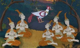 ครั้นในกาลเวลาต่อมา พระโพธิสัตว์ทั้ง ๕ ก็ประสูติออกจากไข่ ปรากฏเป็นมนุษย์บุรุษรูปงามทั้ง ๕ พระองค์ และเจริญเติบโตอยู่กับแม่เลี้ยงด้วยความกตัญญู รู้จักหน้าที่ ทดแทนบุญคุณจนถึงอายุได้ ๑๒ ปี ด้วยบุญกุศลเก่าหนุนส่งก็มีจิตคิดที่จะออกบวชบำเพ็ญเนกขัมมะบารมี เป็นฤาษีอยู่ในป่า จึงได้อำลาแม่เลี้ยงของตนเหมือนกันทั้ง ๕ พระองค์ ฝ่ายแม่เลี้ยงก็ไม่ขัดความประสงค์ อนุญาตให้ลูกไปบวช บำเพ็ญบารมีอยู่ในป่าด้วยความอนุโมทนา
