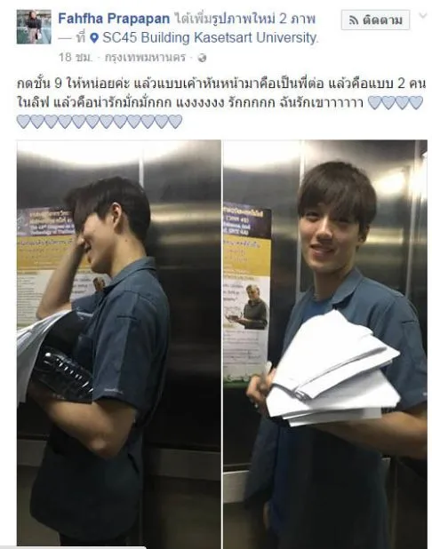 สาวสุดแสนจะโชคดีที่บังเอิญ ไปมหาวิทยาลัยแล้วขึ้นลิฟต์พร้อมกับหนุ่มต่อ ธนภพ ทำเอาใจสั่นกันเลยทีเดียว แพ้ความน่ารักสุดๆ จนต้องถ่ายรูปแล้วโพสลงเฟส ทำเอาสาวคนอื่นอิจฉาตามๆกัน แถมยังพากันมาคอมเม้นอีกด้วย
