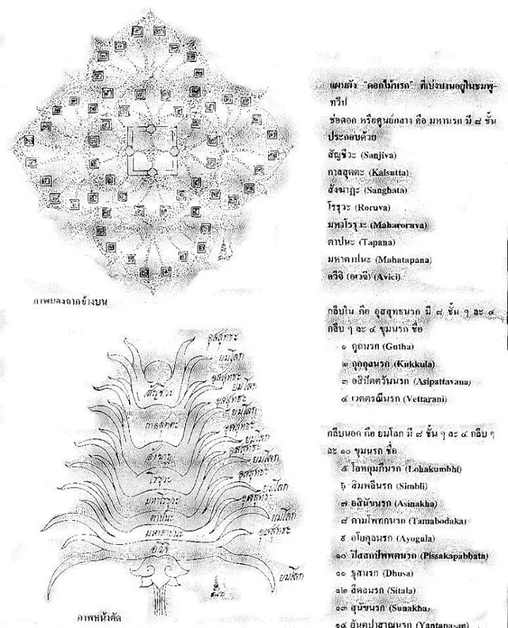 ๒.กลีบใน คือ อุสสุทธนรก มีทั้งหมด ๘ ชั้น ชั้นละ ๔ กลีบ กลีบละ ๔ ขุมนรก(มีทั้งหมดรวม ๑๒๘ ขุม)