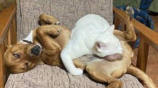 แชร์สนั่น! น้องแมวและหมา นอนท่าแบบนี้ หนุนได้ถูกจุดมาก